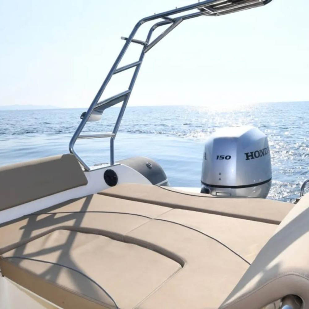 Provista de gran toldo con zona de solarium, radio bluethoot, en proa y popa plataforma baño muy amplia y cómoda.