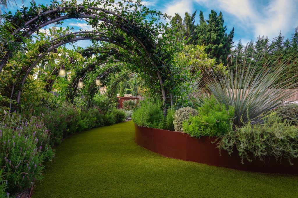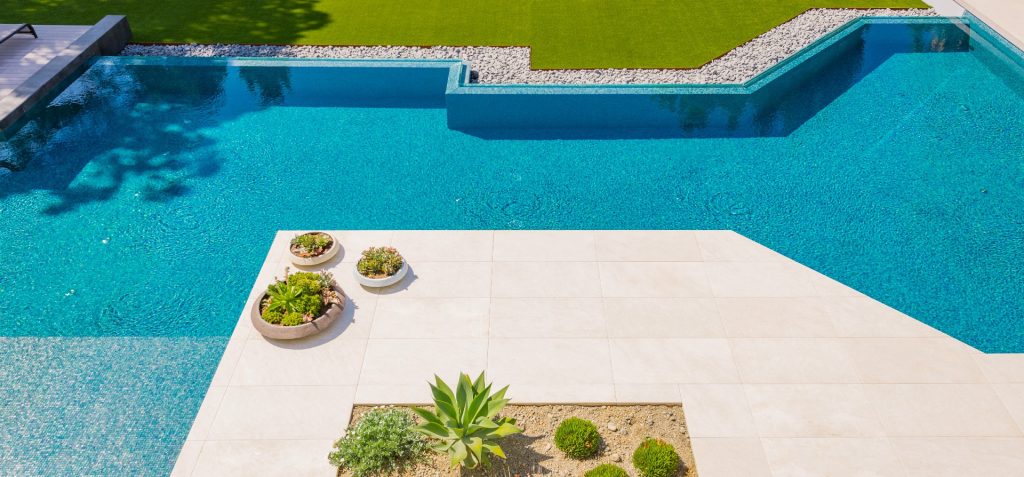 Los espacios exteriores incluyen jardines privados, una piscina de diseño con azulejos de mosaico (calentamiento opcional), y estacionamiento sobre rasante y subterráneo, con acceso mediante un ascensor de coches.