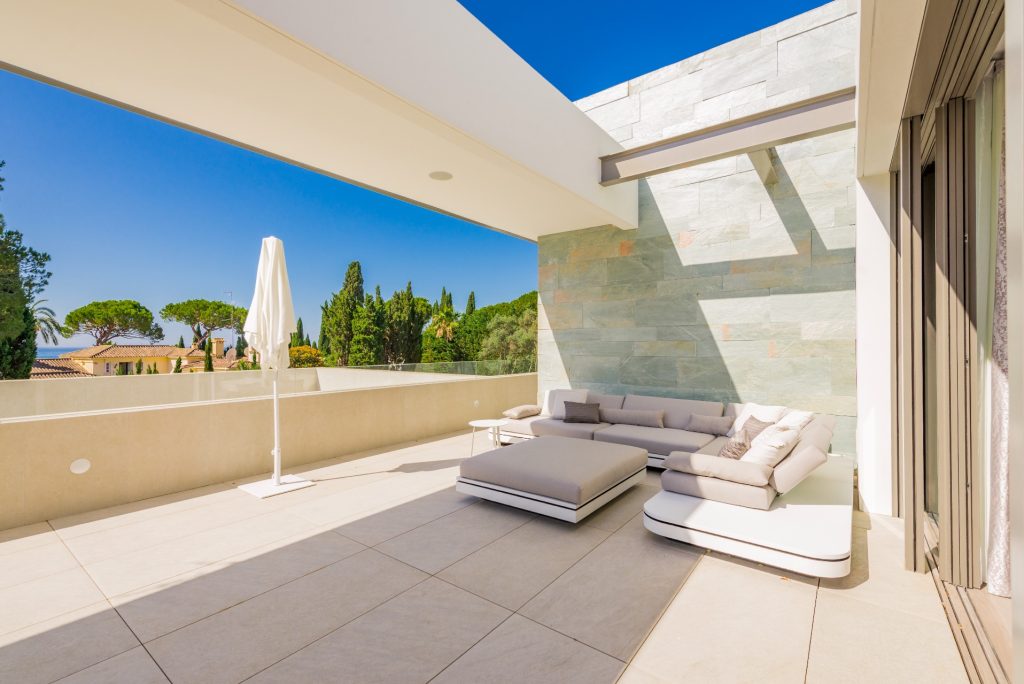 En el nivel superior se encuentra el solárium, accesible mediante una elegante escalera curva de mármol o un ascensor de vidrio que conecta todos los niveles. Este espacio ofrece zonas de descanso y vistas panorámicas al mar, proporcionando un entorno perfecto para la relajación y el entretenimiento.