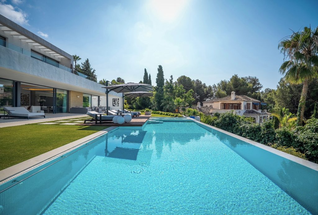 Esta villa ha sido diseñada para ofrecer una estancia de lujo y sofisticación. Con siete habitaciones y baños meticulosamente diseñados, la propiedad ofrece un nivel de confort incomparable. Disfruta de la piscina climatizada con vistas al horizonte, relájate en el spa con sauna y jacuzzi, o mantente activo en el gimnasio privado. Comienza cada día con un café recién hecho en su cocina de última generación, equipada con electrodomésticos Miele y Neff de alta gama.