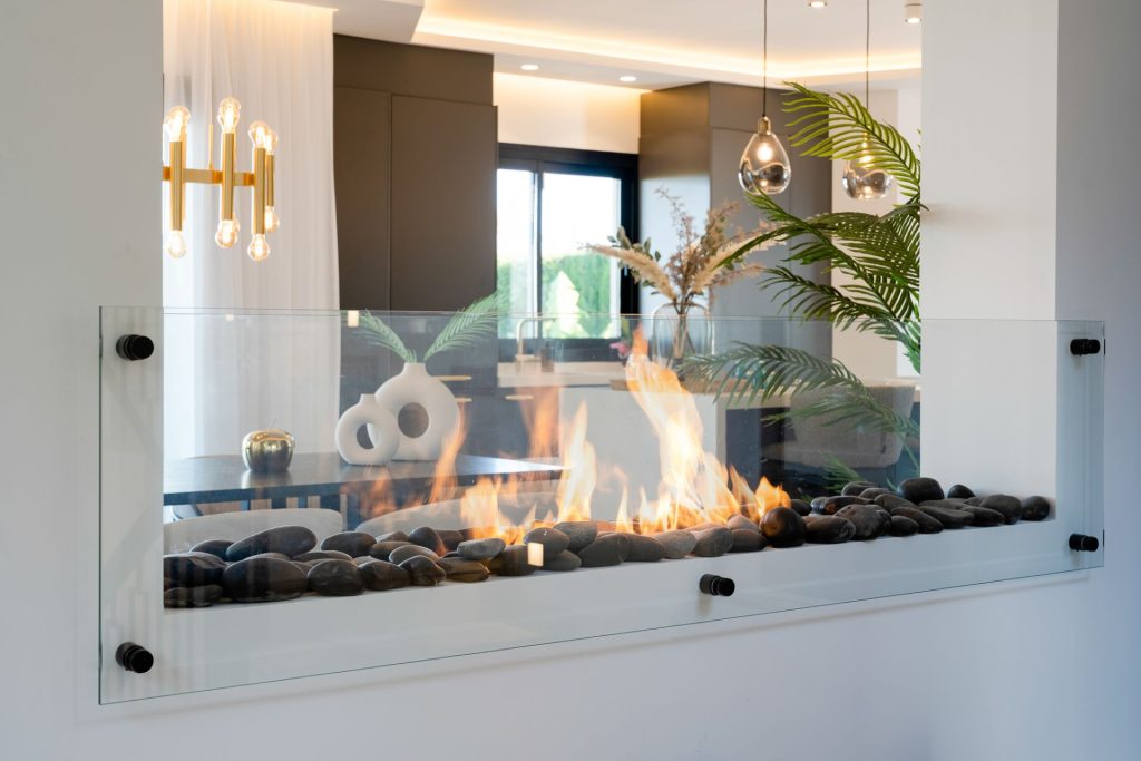 Al entrar en la propiedad, serás recibido por una cocina de concepto abierto junto con un amplio salón, ambos con vistas impresionantes al mar. El diseño escandinavo, con muebles de alta calidad y una cocina de última generación, aporta una sensación acogedora y elegante a la planta baja. Desde el salón, se accede directamente a una amplia terraza, ideal para entretenimiento y relax, donde se puede disfrutar de la vista panorámica de la costa y el mar Mediterráneo.