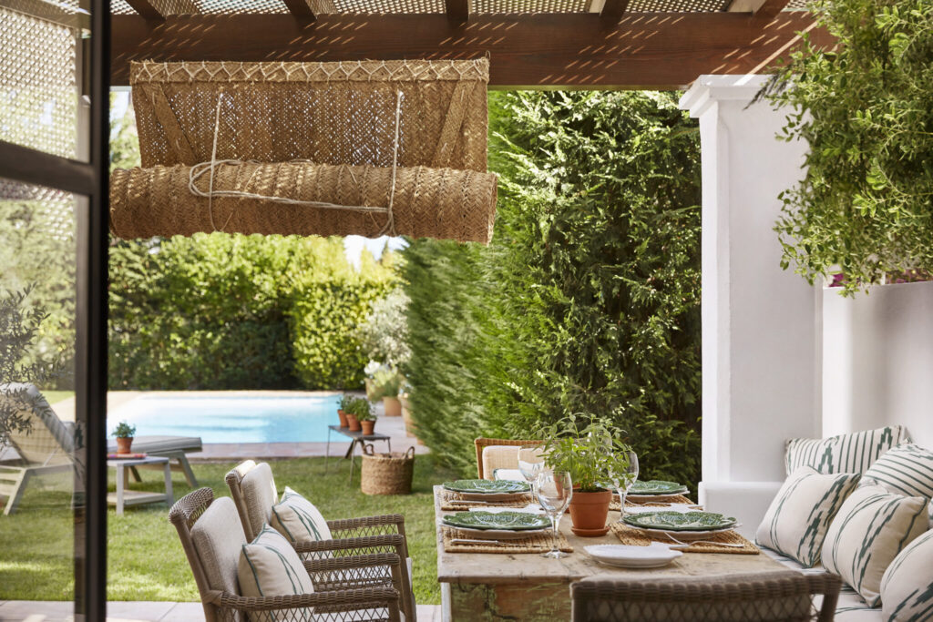 En la planta superior, la villa dispone de dos terrazas privadas, ideales para la relajación, rodeadas de materiales naturales y detalles artesanales como azulejos pintados a mano, ropa de cama orgánica y mobiliario de ratán refinado, aportando un encanto andaluz tradicional a cada espacio.