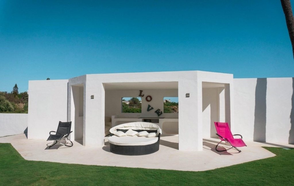 El exterior de Villa Ribalta es un auténtico oasis de tranquilidad, con una magnífica pérgola con zona de BBQ y un salón exterior parcialmente cubierto, perfecto para disfrutar de noches estrelladas.