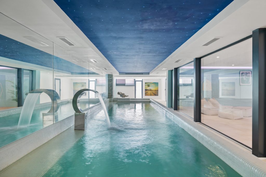 Esta propiedad exclusiva ofrece no solo un espacio cómodo para vivir, sino también un emocionante SPA y un área de fitness con salón y sala de masajes., sauna, Baño turco, ducha, gimnasio totalmente equipado, piscina cubierta climatizada (12m × 3m) en el sotano; así como una zona de ocio de 413 m2 con un gran cine, bodega y sala de juegos; terrazas y balcones cubiertos y abiertos con impresionantes vistas al mar. Hay una terraza para tomar el sol con un lounge bar en el segundo piso y la espectacular terraza en la azotea cuenta con una pequeña piscina., solarium y bar. Gracias a las enormes ventanas panorámicas., puertas de cristal y barandillas, la casa disfruta de mucha luz natural y sol. La piscina exterior de agua de mar de 15m x 6m ofrece el lugar perfecto para un baño relajante mientras contempla el Mediterráneo.