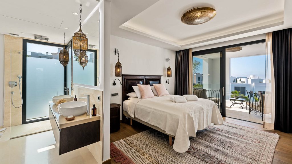 El interior de la villa cuenta con 6 elegantes dormitorios, cada uno con su propio baño en suite. La decoración combina elementos modernos con toques marroquíes, incluyendo lámparas ornamentales y detalles cuidadosamente seleccionados que aportan calidez y sofisticación.