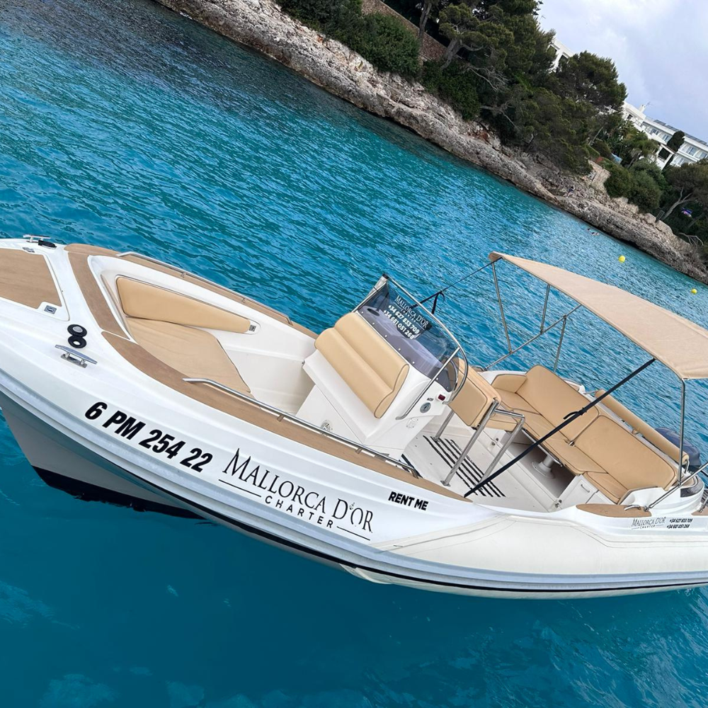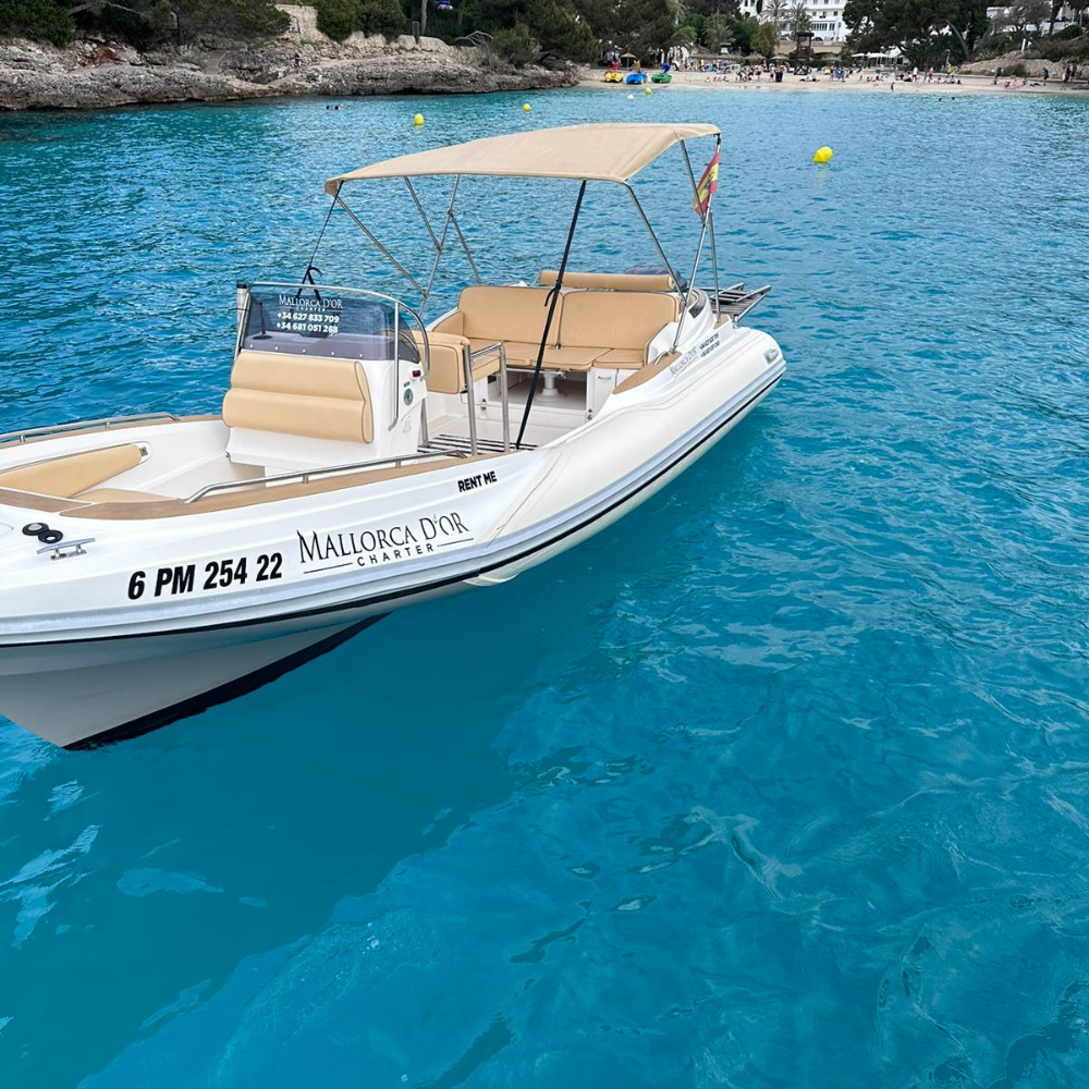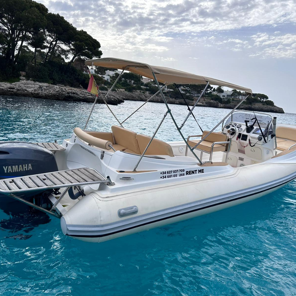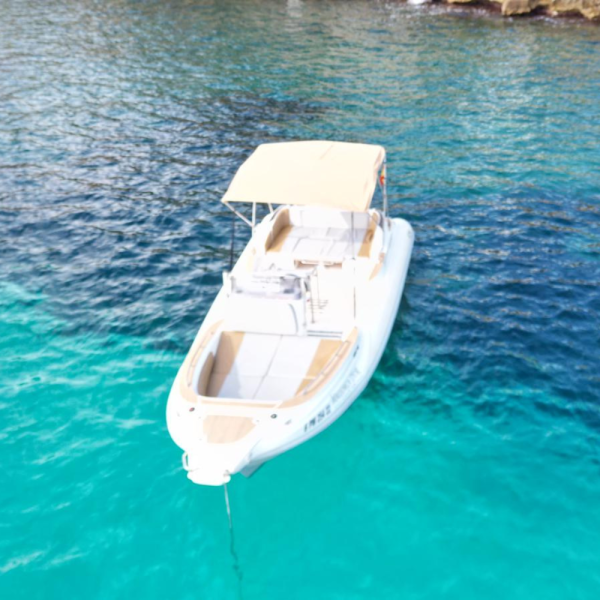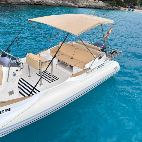 Provista de toldo con zona de solarium y ducha en la parte de proa, radio bluethoot, en proa y popa plataforma baño muy amplia y cómoda.